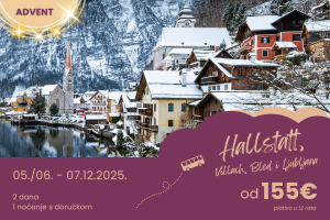 Idealan spoj uživanja u prirodnim ljepotama te živahnim i toplim adventskim sajmovima. Nakon obilaska jednog od najljepših austrijskih jezera – Hallstattskog, odnosno bajkovitog Bleda, bisera slovenskih Alpi, slijedi čarolija adventskih sajmova uz miris kuhanog vina i božićnih kolačića u Villachu, odnosno Ljubljani.