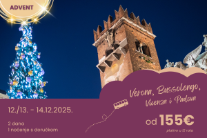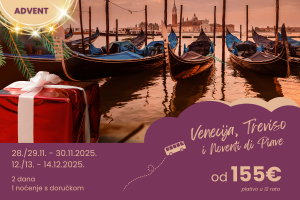 Putovanje idealno kako za one koji žele uživati u romantičnim šetnjama ‘Kraljicom Jadrana’, tako i u povoljnom predblagdanskom shoppingu u jednom od najpopularnijih talijanskih outleta. Bonus: izlet u slikoviti Treviso, gradić u kojem je nastala jedna od najpoznatijih talijanskih slastica – tiramisu.