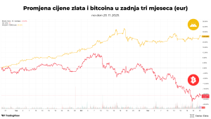 Istovremeno, cijena zlata bilježi rast. Cijena jedne unce žutog plemenitog metala izražena u eurima tako je u zadnja tri mjeseca porasla za oko 23%, a od početka godine za čak 40%.