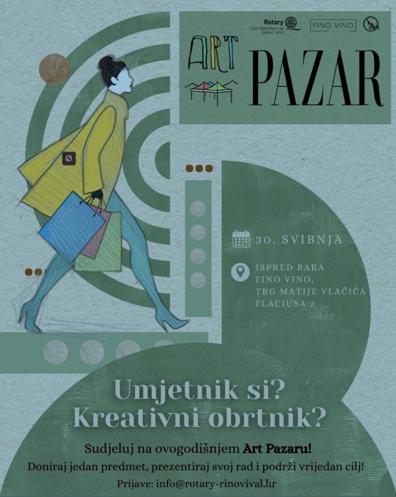 „Rotary klub Rijeka Novi val otvara prijave za ovogodišnje izdanje Art Pazara“ Rotary klub Rijeka Novi val i ove godine organizira umjetničko-donacijski event pod nazivom Art Pazar, posvećen promociji lokalnih umjetnika, obrtnika i malih domaćih brendova, uz prikupljanje sredstava za ekološke inicijative. Cilj događaja je promocija stvaralaštva autora koji u svome radu koriste prirodne i ekološki prihvatljive materijale, uključujući slike, nakit, odjeću i različite rukotvorine.