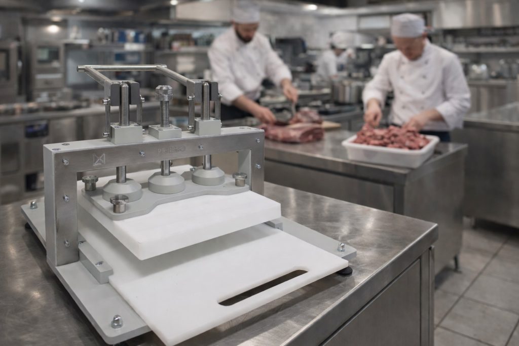 Presso omogućuje bržu, tišu i uredniju pripremu mesa, bez špricanja i bez zamaranja ruku. Umjesto klasičnog lupanja, meso se obrađuje kontroliranim pritiskom, što rezultira ujednačenijom kvalitetom i boljim izgledom gotovog proizvoda.